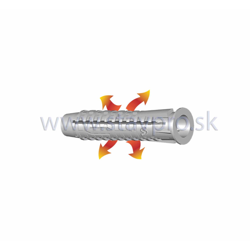 Profesionálna 4-zónová nylonová hmoždinka s golierom – absolútny bestseller medzi univerzálnymi hmoždinkami. Vďaka unikátnej geometrii a antirotačným krídelkam drží dokonale vo všetkých materiáloch: betón, plná tehla, dutá tehla, pórobetón, sadrokartón, drevotrieska. V plných materiáloch sa rozopiera, v dutých vytvára pevný uzol. Golier chráni obklady a omietku pred poškodením.
