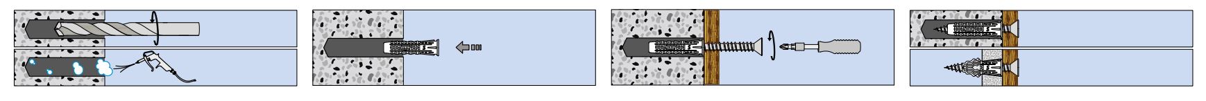 1. Vyvŕtajte otvor podľa veľkosti hmoždinky (v dutých materiáloch bez príklepu)