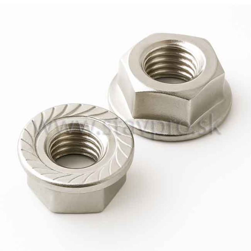 Šesťhranná matica s integrovanou ozubenou prírubou podľa normy DIN 6923 (prevailing torque type, flange nut with serrated flange) vyrobená z nerezovej ocele A2 (1.4301 / AISI 304). Ozubená príruba zaisťuje vysokú odolnosť proti samovoľnému uvoľneniu pri vibráciách a dynamickom zaťažení. Príruba zvyšuje plochu dosadnutia, eliminuje potrebu samostatnej podložky a zlepšuje rozloženie zaťaženia. Vysoká odolnosť proti korózii – ideálna pre exteriér, vlhké prostredie, potravinárstvo, bazény, chemické prostredie alebo námorné aplikácie.