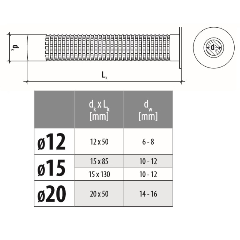 sa malta v dutom materiáli volne roztečie). Rozmer sitka ø12 pre M6/M8, ø15 pre M8/M10, ø20 pre M12/M14/M16.