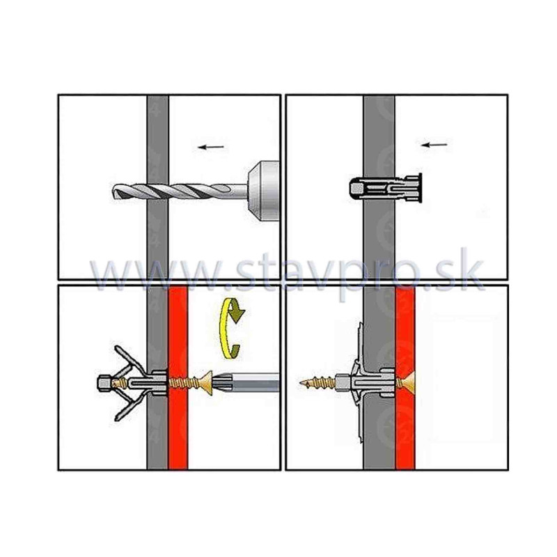 - Montáž skrutky: Dotiahnite skrutku, kým sa hmoždinka nerozoprie v dutine.